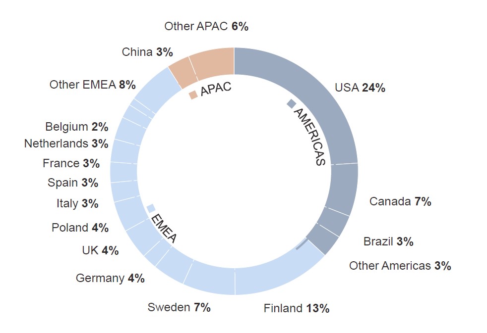 The US is the largest country in terms of sales and it accounted for 24% of revenue in 2024. Finland, the second largest country by sales, accounted for 13%.