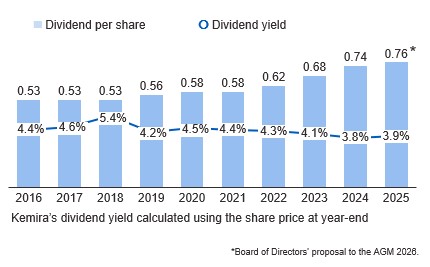Kemira’s dividend policy aims at paying a competitive and over time increasing dividend.